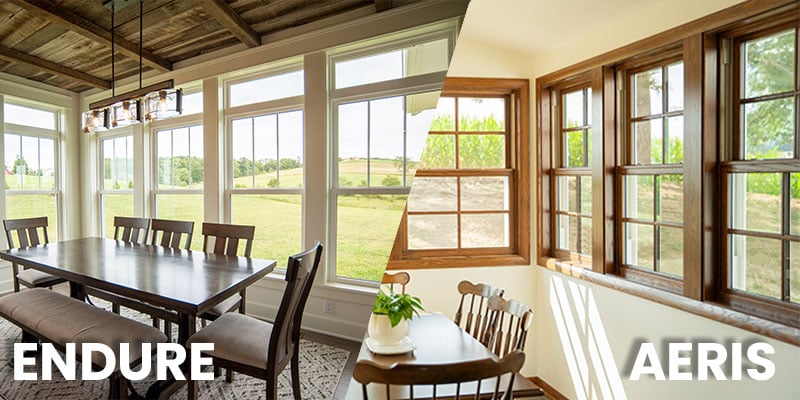 Endure is a fully vinyl window designed for energy efficiency and value, while Aeris features a real wood interior with a vinyl exterior for a more premium look.